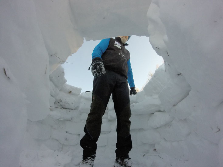 Laboratori winter con costruzione di igloo o tana di volpe ( in base alle condizioni del manto nevoso) e prove pratiche si ricerca su neve con strumentazione artva.